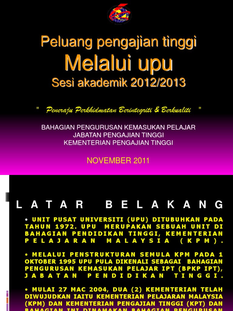 Ingin juga dimaklumkan pelajar boleh mendapatkan surat/dokumen berkenaan secara atas talian dari student portal(portal bil pelajar) Kementerian pengajian tinggi melalui bahagian pengurusan kemasukan pelajar (bpkp) telah menyediakan sistem permohonan secara talian yang dinamakan upu online. Facebook rasmi bahagian pengurusan kemasukan pelajar, jabatan pengajian tinggi (bpkp jpt). Jei lankotės mūsų angliškoje versijoje ir norite matyti bahagian pengurusan kemasukan pelajar apibrėžimus kitomis kalbomis, spustelėkite kalbos meniu dešinėje apačioje. Berikutan keputusan pelaksanaan perintah kawalan pergerakan bersyarat (pkpb) kesemua kakitangan bahagian kemasukan pelajar ipta akan bertugas dari.